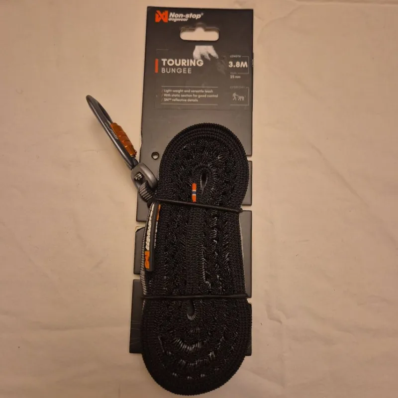 Ny och oanvänd Non-stop Touring Bungee koppel, 3.8 meter lång och 23 mm bred. Lättviktig och mångsidig koppel med statisk del för bra kontroll och 3M™ reflexdetaljer för ökad säkerhet.