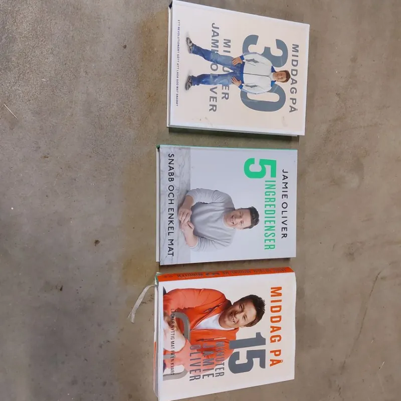 Tre kokböcker av Jamie Oliver: Middag på 30 minuter (ISBN 9789174243123), 5 ingredienser (ISBN 9789174243208), och Middag på 15 minuter. Snabb och enkel mat med fokus på få ingredienser och minimal tillagningstid. Perfekt för den som vill laga god mat snabbt och effektivt.