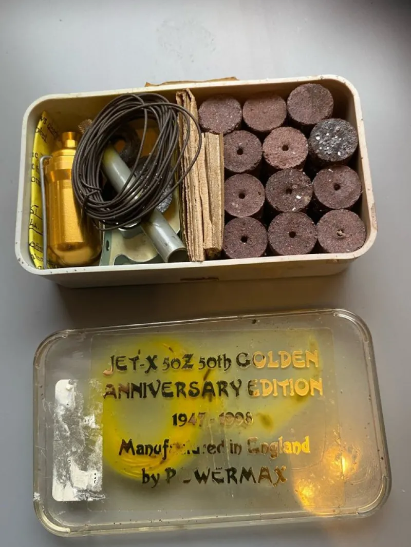 Modellraketuppsättning JET-X 50z 50th Golden Anniversary Edition, tillverkad i England av Powermax 1947-1998. Innehåller alla delar som visas på bilderna. En unik och samlarobjekt för modellraket entusiaster.
