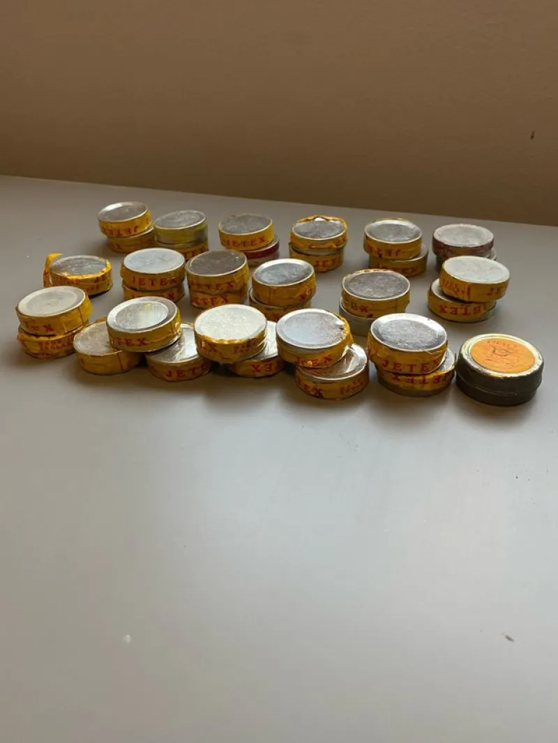 Övre 30 små plåtburkar.