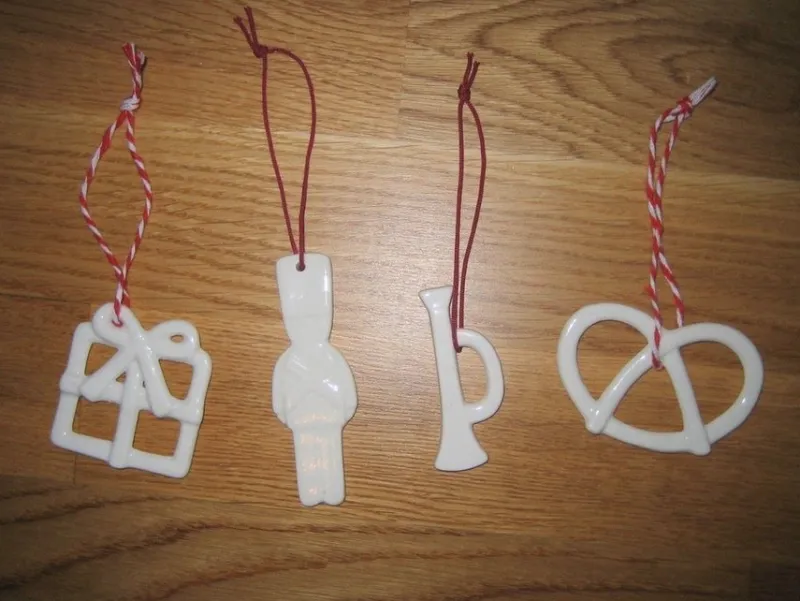 Fyra vita julgranspynt i porslin/keramik. Motiv: paket, trumpet, nötknäppare/ tennsoldat och kringla/ pretzel. Till julgran eller hängas på annat som dekoration.