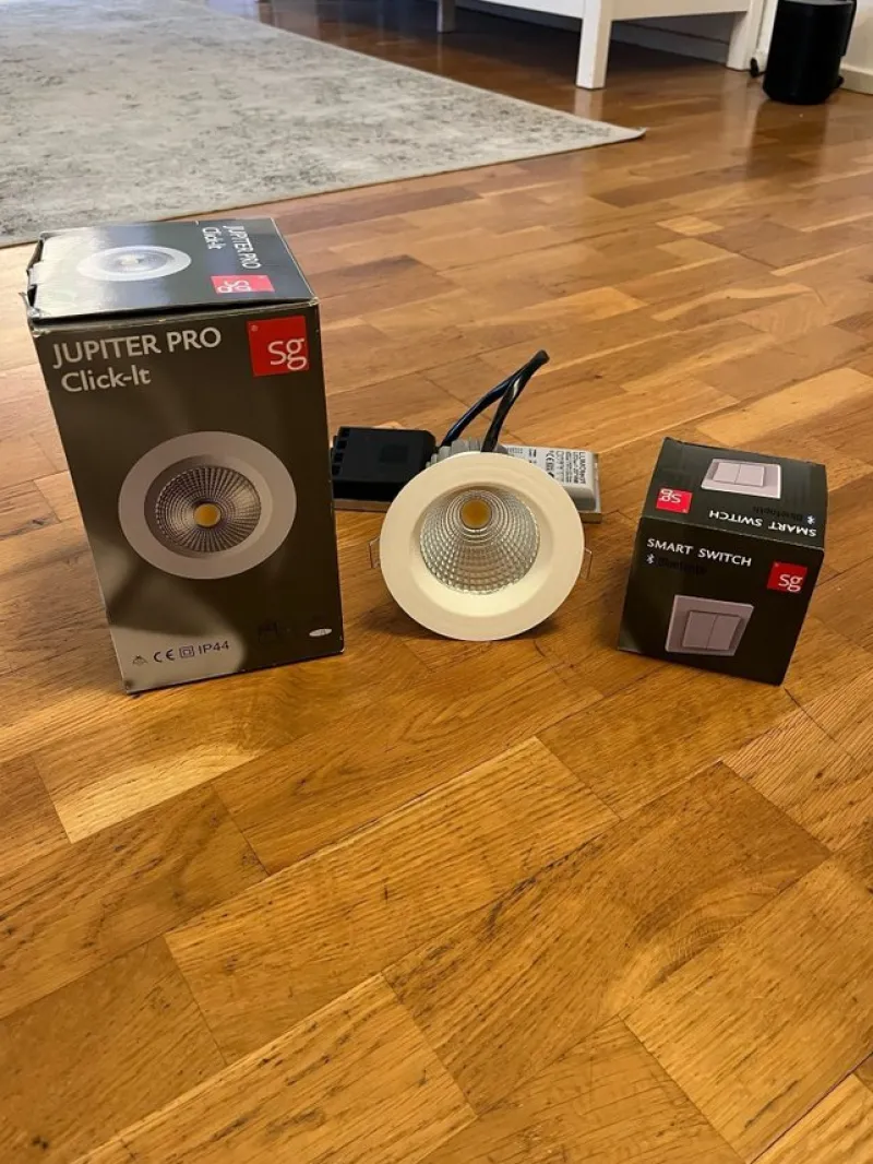 Säljer en sats med 2st Jupiter Pro Click-It LED-spotlights för inom och utomhusbruk och en Smart Switch med Bluetooth.