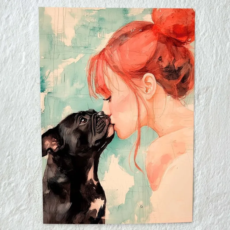 Högkvalitativt tryck: En rörande och känslomässig illustration av en kvinna och hennes hund som delar en ömsint stund, tryckt på A4 premium glansigt papper.
