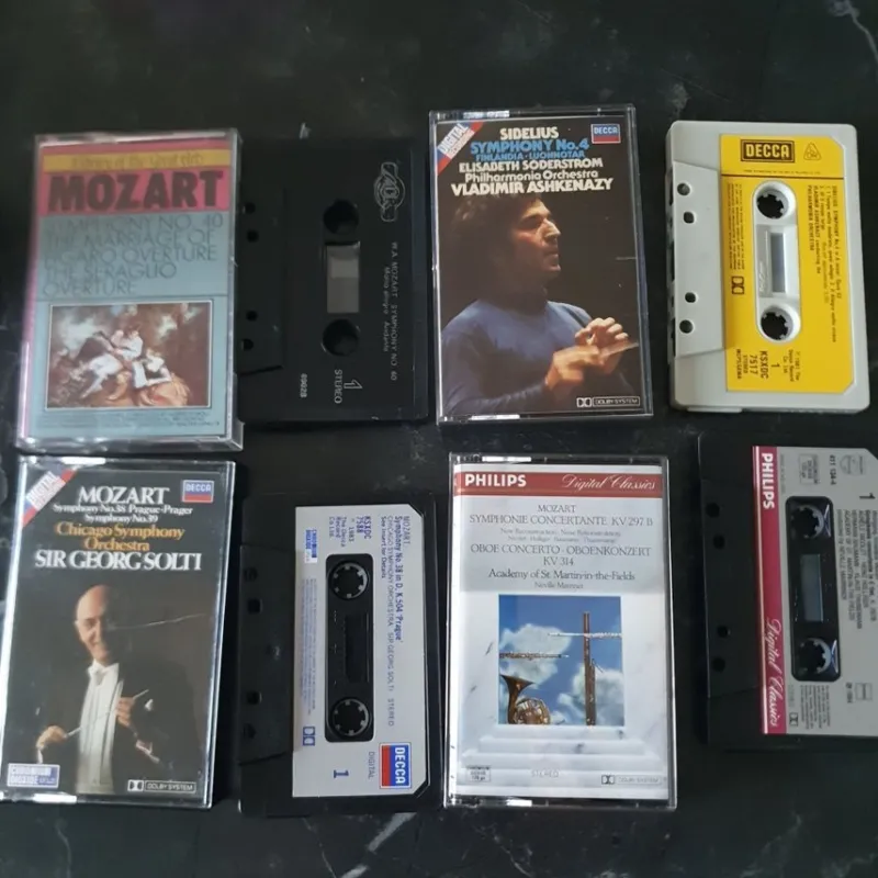 Samling av klassiska musik kassetter. Inkluderar verk av Mozart (Symfoni nr 40, Figaros bröllop, Seraglioöverturen, Symfoni nr 36, Oboe-konsert), Sibelius (Symfoni nr 4). Dirigenter inkluderar Vladimir Ashkenazy och Sir Georg Solti. Se bilder för detaljerad information om artister och verk.