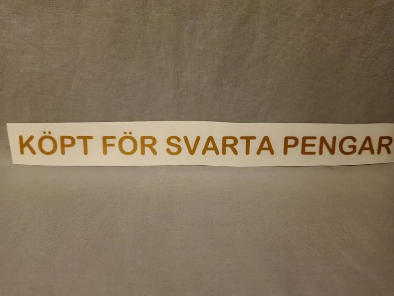1 styck dekal med texten KÖPT FÖR SVARTA PENGAR, konturskuren i guld-metallic folie. Bredd 300 mm Höjd 20 mm.