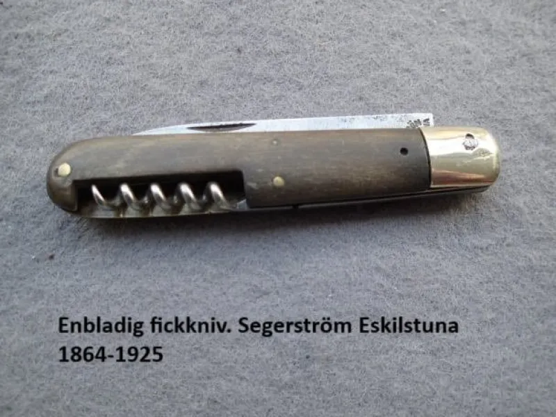 En fickkniv tillverkad av E.T. Segerström Eskilstuna. Företaget verksamt mellan åren 1864-1925. Skaft av horn med ändbeslag av stål. Hopfälld så mäter den 103 mm. Jag skrev lite ovanlig i rubriken pga denna kniv har bara ett blad och vanligtvis är knivtypen försedd med ett större och ett mindre blad. Kniven är i bra skick.