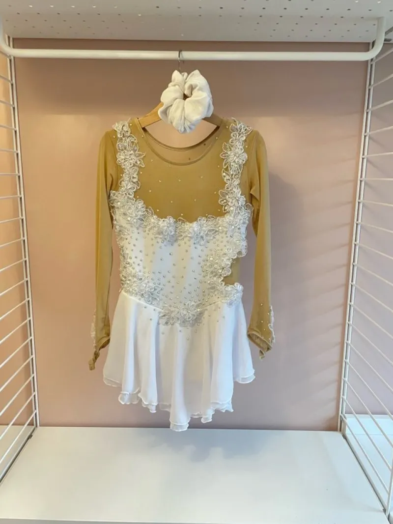 Fin vit konståkningsklänning. Min dotter använde den till slingtävling/första tävling när hon var 7 år. Kan vara någon sten som åkt av och där är någon liten fläck på kjolen som jag inte försökt få bort då det inte syns på isen.
