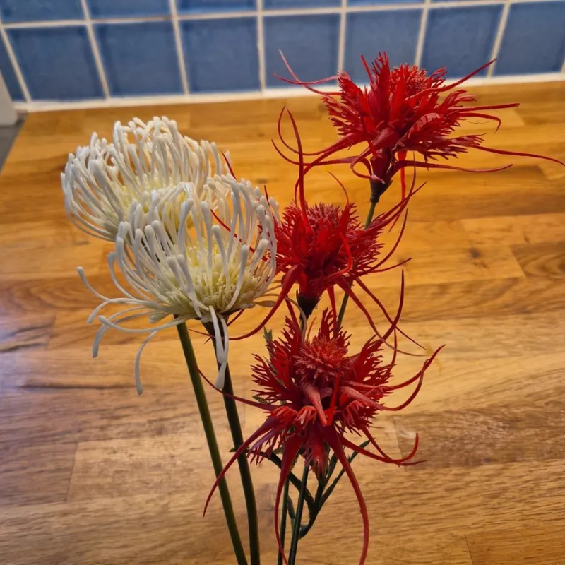 Bukett med konstgjorda blommor i rött och vitt med gröna blad och stjälkar.
