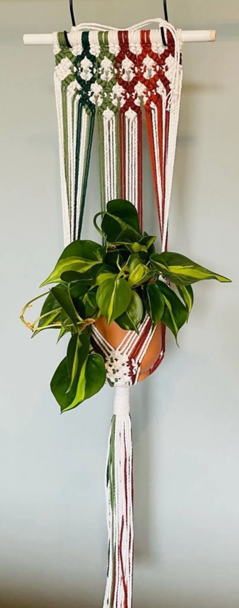 Hängare för växt i macrame stil. Hängaren är handgjord och gjord av bomullsrep. Den är perfekt för att visa upp dina favoritväxter.