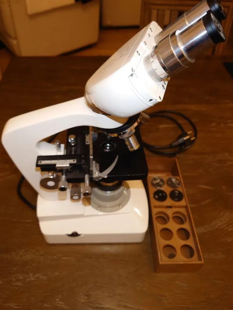Mikroskop av märket Kyowa Tokyo, modell L8B-3AC, serienummer 765267. Speciellt tillverkat för Selefa. Inkluderar ett urval av objektiv. Totalt tre par olika objektiv.