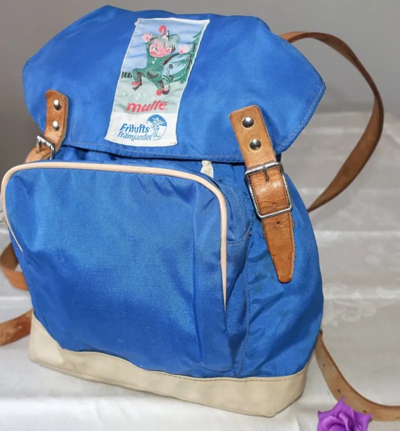Tradera Liten ryggsäck från 60-talet/ Vintage/ Blå ryggsäck/ Nylon/ Läder/ Galon> Övriga Barnartiklar