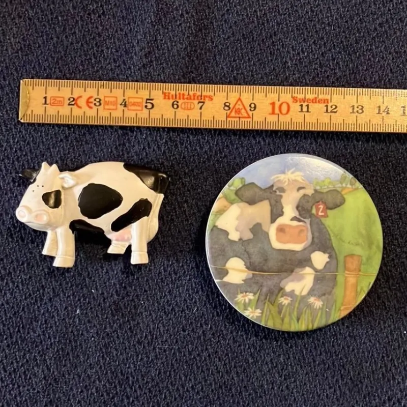 Söt liten ko figur och en liten platta med en ko på. Perfekt för att dekorera kylskåpet eller barnrummet.