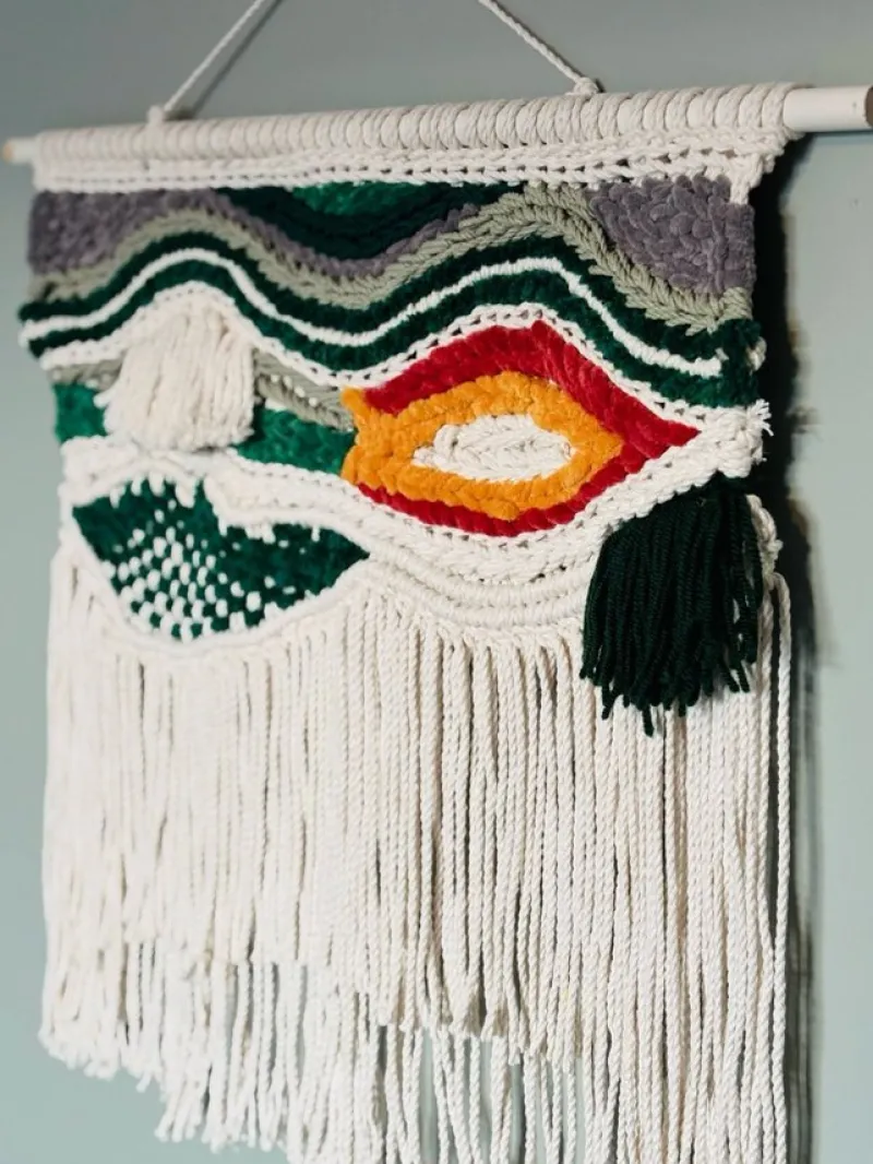 Handgjord Väggbonad i makramén med weaving teknik , gjord av bomull garn och Weaving (broderad ) med akryl garn
