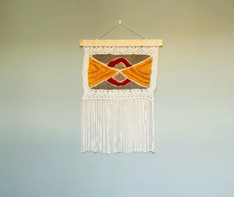 Handgjord väggbonad i macrame med olika geometriska former i olika färger . Perfekt för att addera en touch av bohemisk stil till ditt hem.