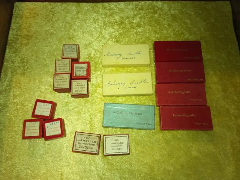 7 gammla lådor med objektglas. lådorna kommer från Frankrike – Paris 1929.