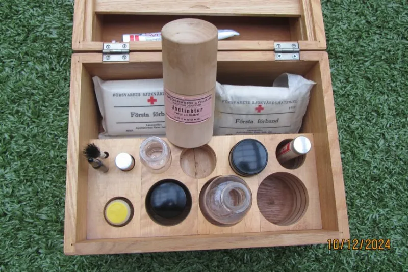 Gammal Första Hjälpen-låda från 40-50 talet med innehåll. Lådan är i massivt trä ( ser ut som ek men är inte säker) med mässingsbeslag. Innehållet är bland annat två förbandspåsar, jodtinktur, salva, och en borste, några flaskor o burkar med mera. Lådan är i mycket gott skick. Innehållet är gammalt och endast för nostalgia.
