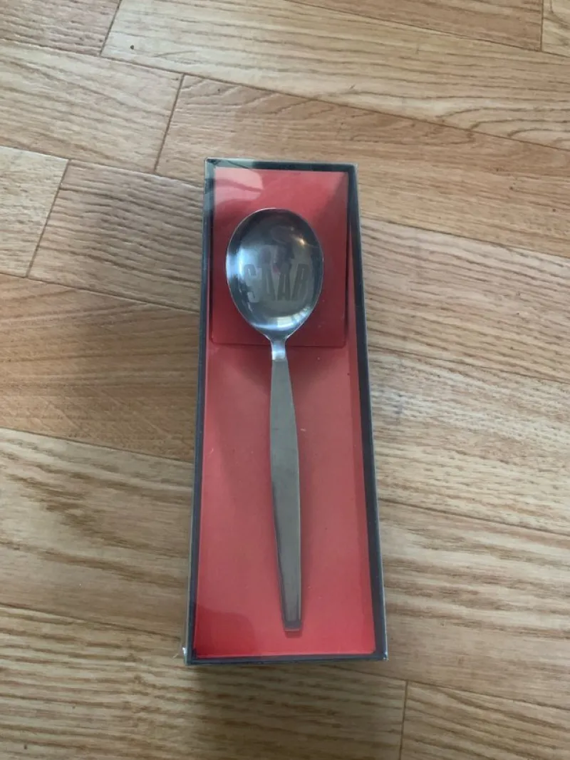 Sked med SAAB-logotyp. Märkt "Rostfritt Stål".