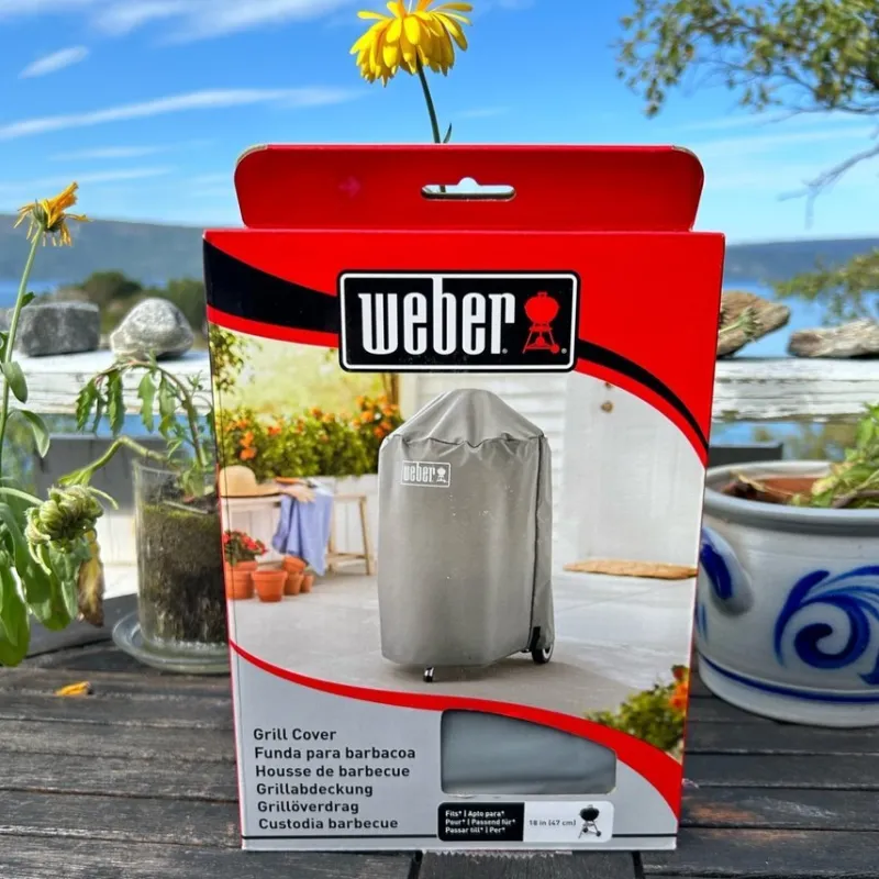New! Unopened. Weber Grill Cover, Weber Original 7175, 47 cm/18 ” in diameter. With original box, which has never been opened. Cover is in gray color. Breathable, water resistant materials protects grill from the elements.