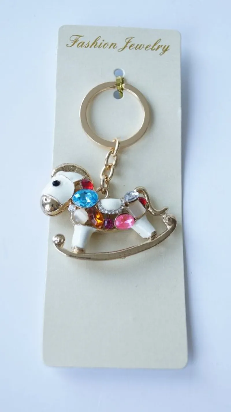 Söt och elegant nyckelring formad som en rocking horse. Dekorerad med glittrande kristaller i olika färger. Perfekt som liten present eller accessoar.