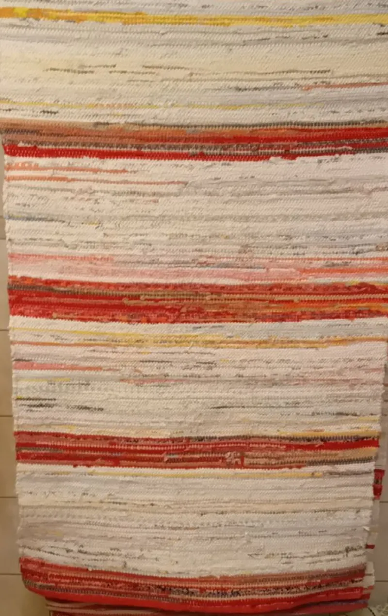 Vacker handvävd matta i olika färger vitt rött rosa gult mfl
