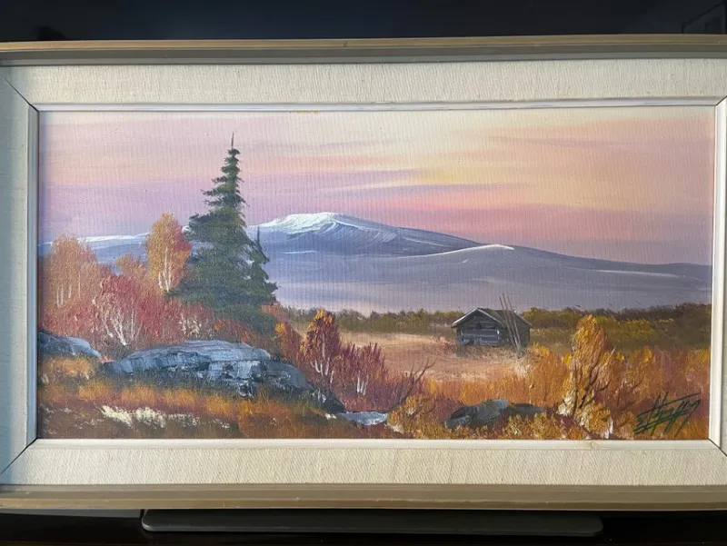 Vacker oljemålning föreställande ett fjällmotiv med stuga. Målningen är utförd i varma färger och fångar en stämningsfull atmosfär. Ett fint konstverk för hemmet.