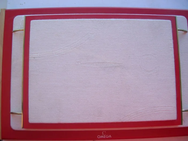 Uppbyggd med övre platta med förgyllda detaljer samt tyginläggning visande urtavlor,visare samt Omegamärket insytt i tyget.