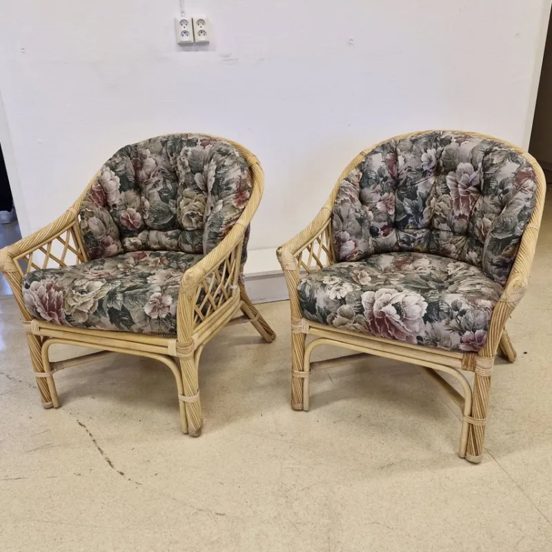 Paret fåtöljer i rotting med dynor – Rottingstolar – Stolar – Rottingfåtöljer