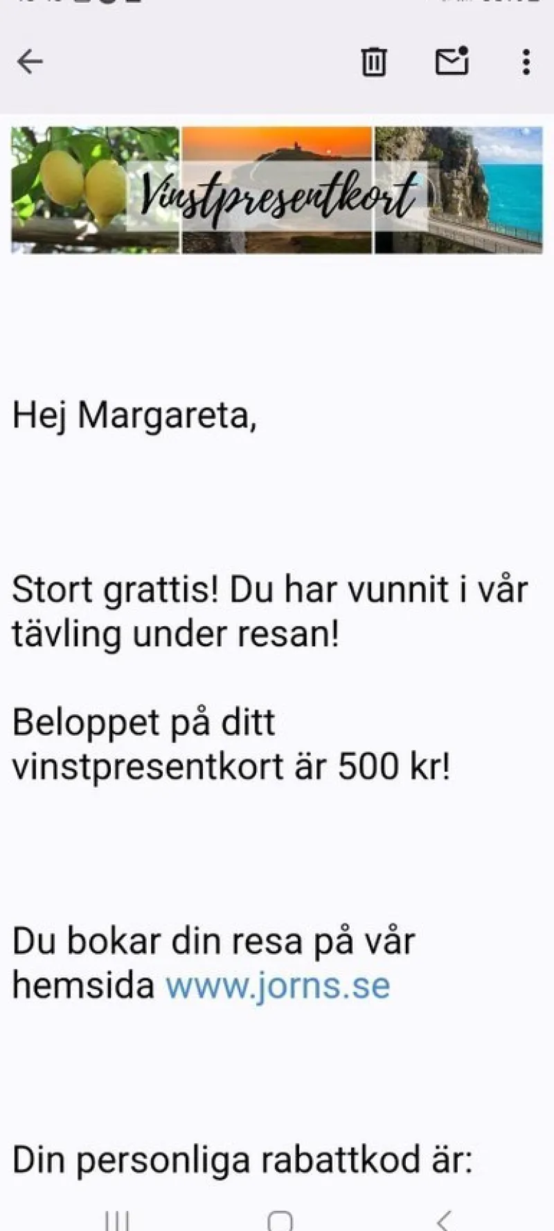 Presentkort på Jörns Resor 500 kr. Resan måste bokas senast 31/3-25, men själva resan kan ske senare.
