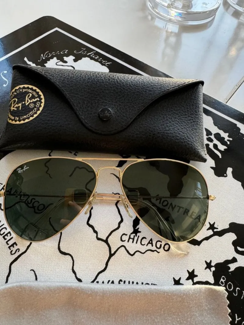 Klassiska Ray-Ban Aviator solglasögon i guld med gröna glas. Levereras med originalfodral och putsduk.