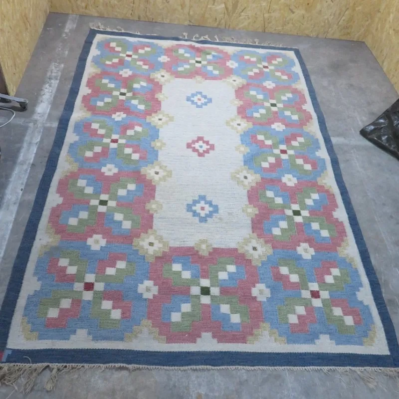 Vintage, retro, Vacker röllakan matta i blå, ljusblå, rosa, beige och grönt.