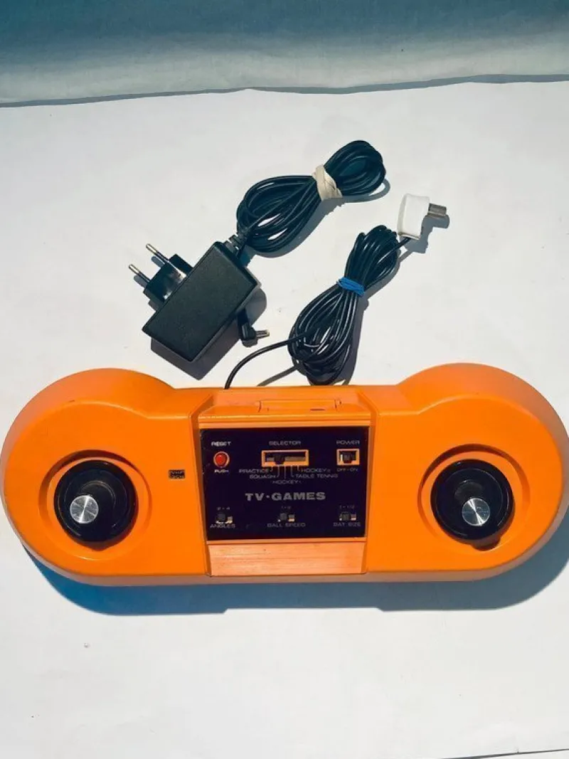 1977 Retro TV Pong Video Game Konsol. ITV-spel med flera spelalternativ, inklusive hockey, squash och bordtennis. Enheten har två rattar för styrning och flera knappar för att justera inställningar som bollhastighet och racketstorlek. Kopplas till tv med antennkabel. Drivs av strömkabel 9V eller 6 st batteri av större modell. Den är i gott skick och nyligen testad med strömkabel som ingår och fungerar perfekt.