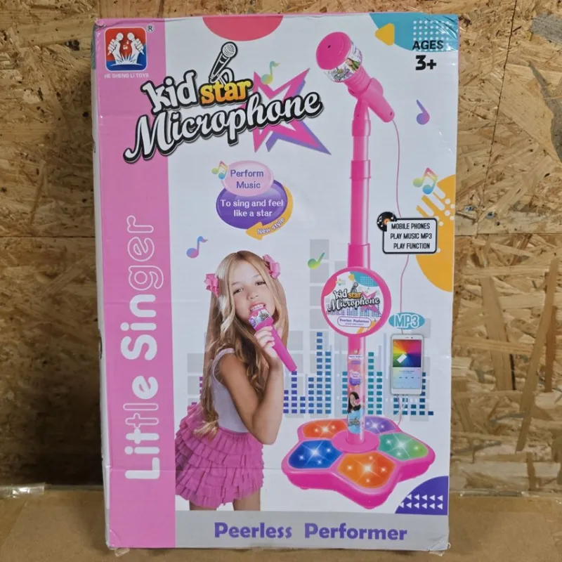 Söt rosa barnmikrofon med stativ, ljus och musikfunktioner. Perfekt för små blivande stjärnor! Mobiltelefon kan anslutas för att spela musik via MP3. Batteridriven. Rekommenderad ålder 3+. Höjd ca 100cm.