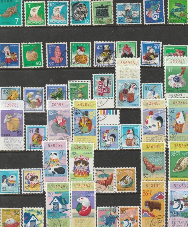 Se bild. Komplett samling av stämplade japanska nyårsfrimärken (dock ej block, kommer delvis erbjudas i framtiden) som utgavs mellan 1970 och 1995. Givetvis finns alla så kallade "lotterimärken" med.
