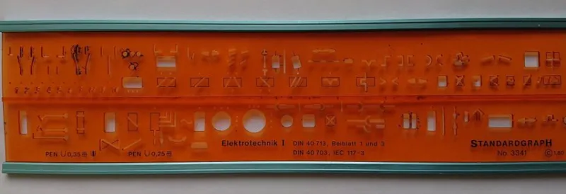 Två schabloner för elektroteknik. En orange och en grön. Perfekta för att skapa professionella tekniska ritningar.