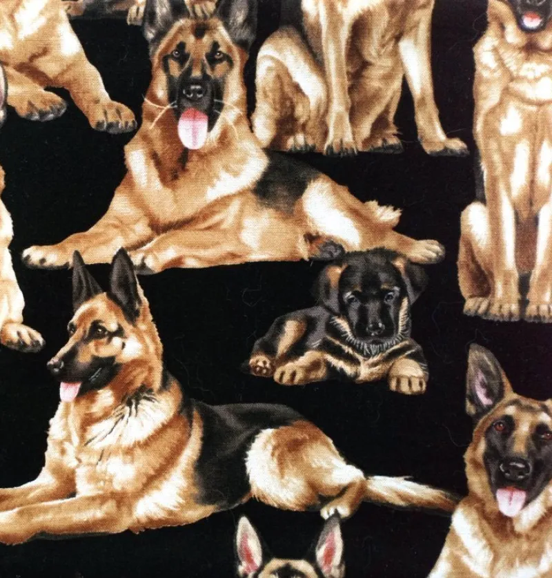 Två grytlappar med underbara tyska schäferhundar som motiv. Härliga smarta vänner! Fint komponerat motiv med tydligt mönster och jämna färger. Designtyg med bra tryck.