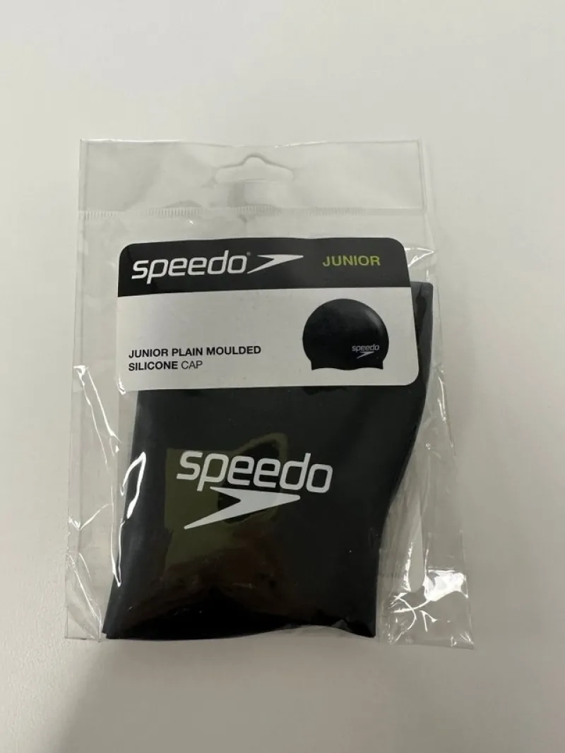 Speedo Junior Plain Moulded Silicone Cap i svart. Perfekt för simning och träning. 3D-formad silikon för förbättrad komfort och passform. One size.