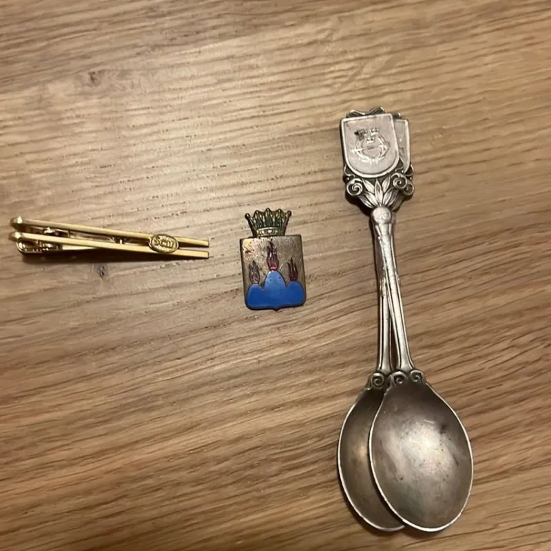 Säljer ett set med smycken och en två skedar. Smyckena är en slipsnål och ett märke Västmanlands landskapsvapen tror jag skedarna är ca 10cm långa och har svenskt skytteförenings (tror jag) märke. Oädla metaller.