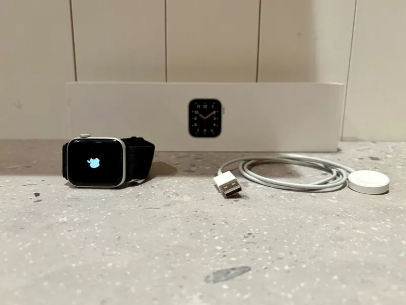 Apple Watch SE 44mm GPS i silver aluminium med svart elastiskt textilarmband. Klockan har en liten repa i ena hörnet men fungerar som den ska. Den levereras med laddningskabel och låda.