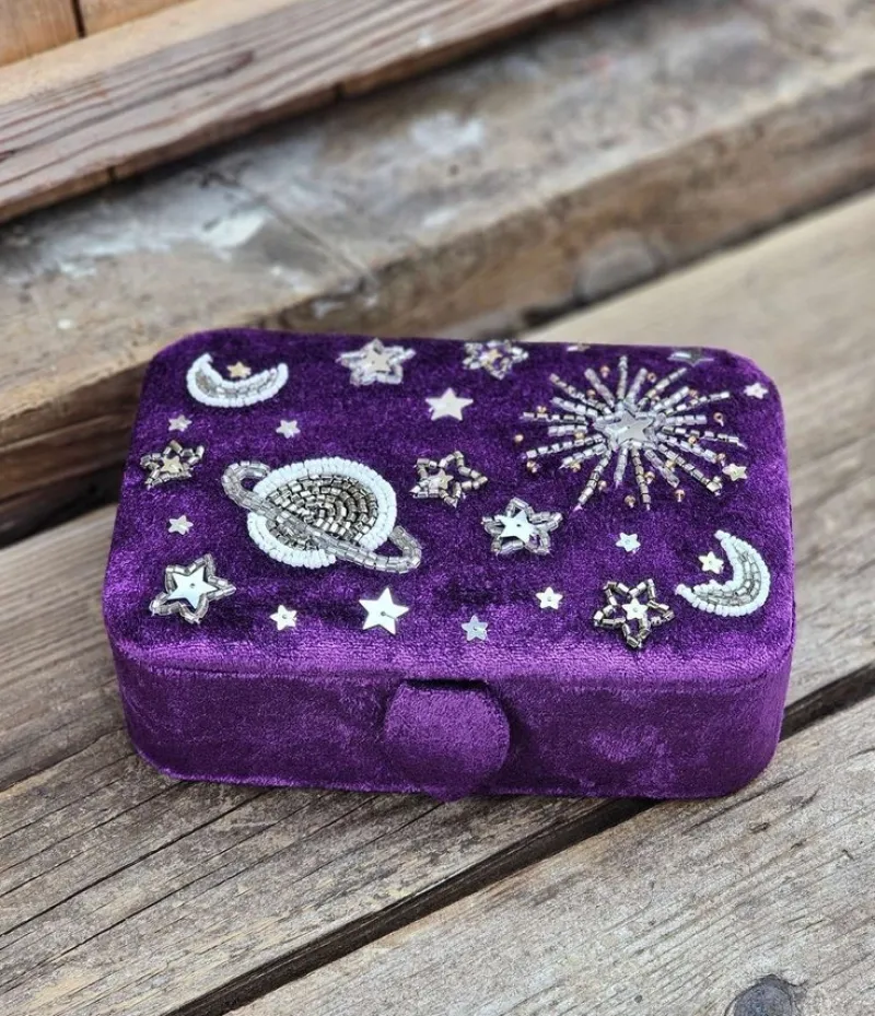 Vacker förvaringsask i sammet med fina broderier och pärlor. Mörklila med stjärnor & planeter, som en vacker galax. En vacker förvaring till små skatter. De läckra färgerna och detaljerna ger denna ask en unik närvaro i ditt hem. Idealisk för smycken, tarotkort, kristaller och andra vackra små ting. Ett litet band med en knapp håller dina tillhörigheter säkra. Säljes styckvis, smycken/kristaller/tarotkort ingår ej. Du köper en slumpvis liknande produkt enligt text & bild ovan. Tänk på att små avvikelser i utseende kan förekomma. Färger kan skilja sig beroende på hur ljuset faller ner på produkten samt även mellan olika bildskärmar m.m.