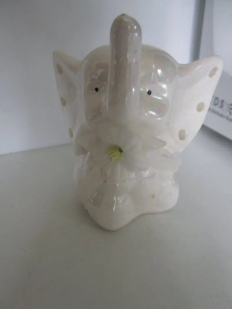 Hängare för ringar och örhängen. Vit elefant av porslin med blank lite pärlemorskimrande yta. Höjd: 9,5 cm vid snabeln, bredd vid öronen: 8 cm. En nagg på baksidan av höger öra (bild 4) annars fint skick.
