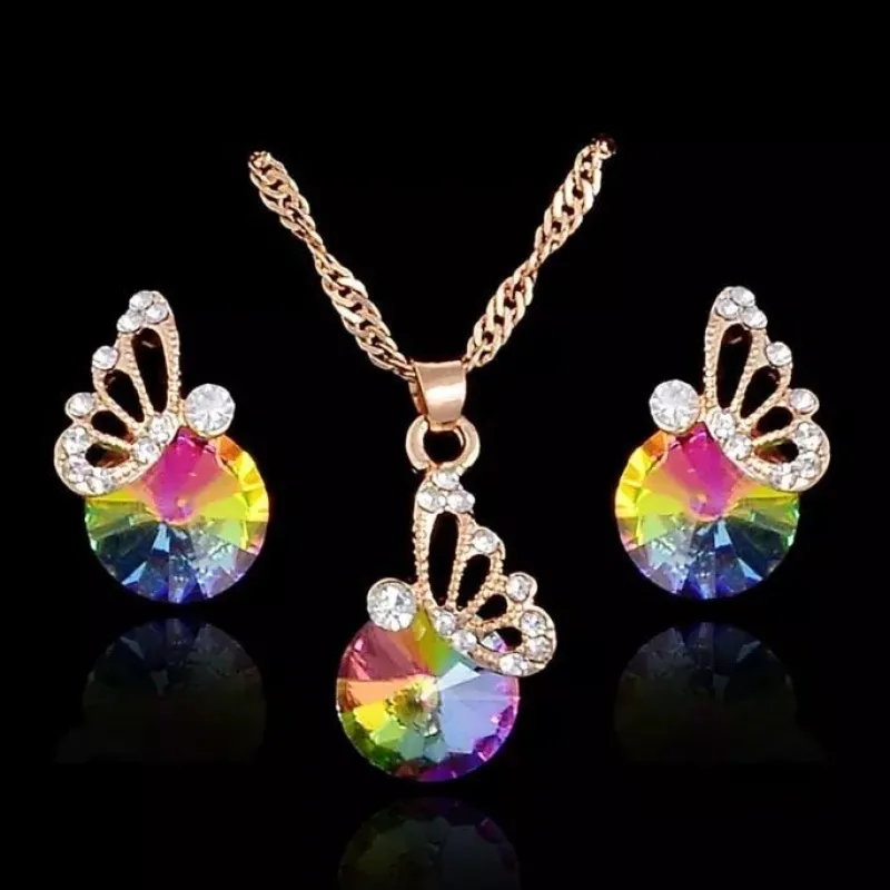 Ett vackert smyckesset med halsband och örhängen. Halsbandet har ett hänge dekorerat med en fjäril med vita CZ kristaller som sitter på en kristall som glittrar i regnbågens färger. Matchande stud örhängen.