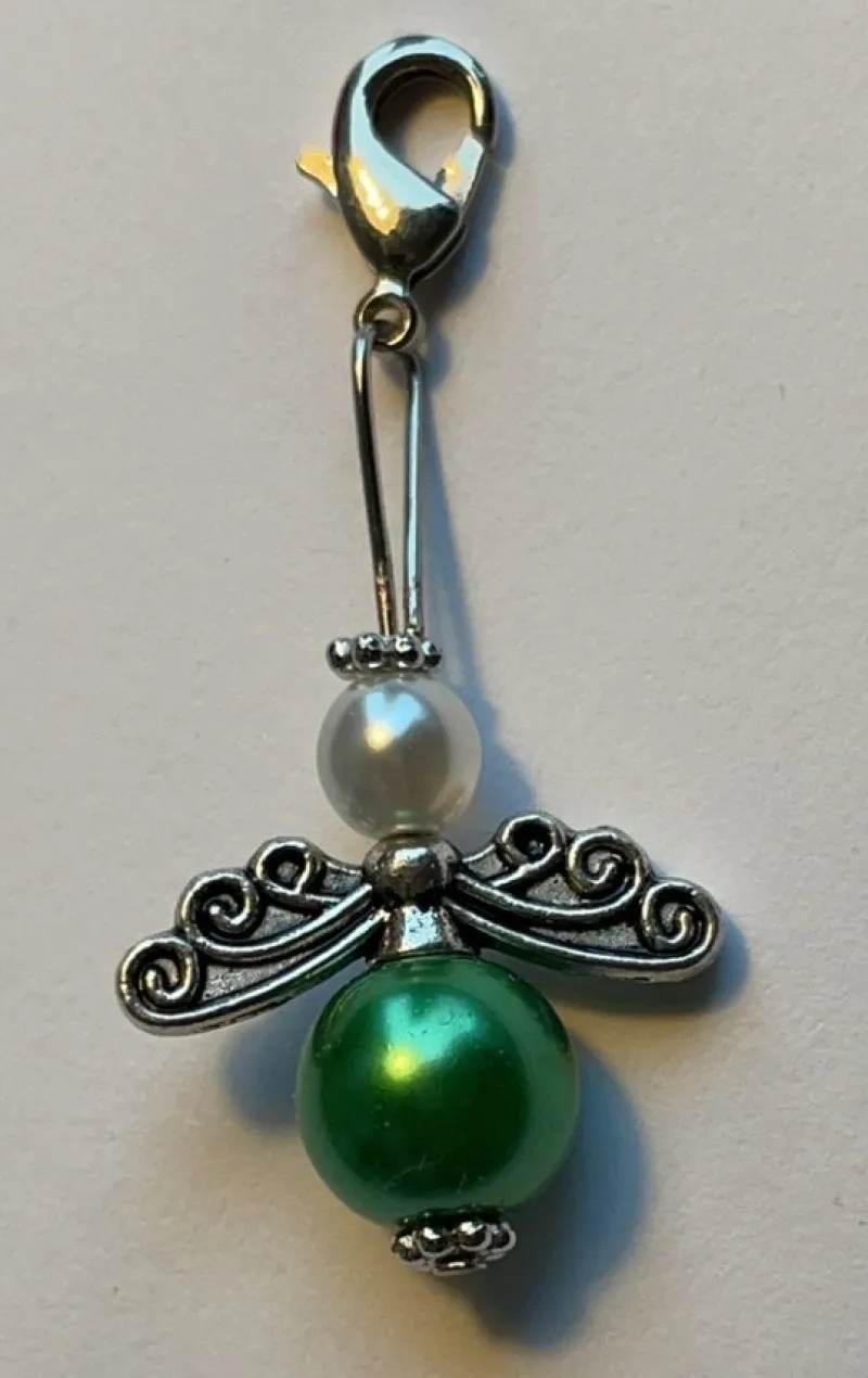 Lyckoängel med silverspänne och liten karbinhake, stenen är julgrön.