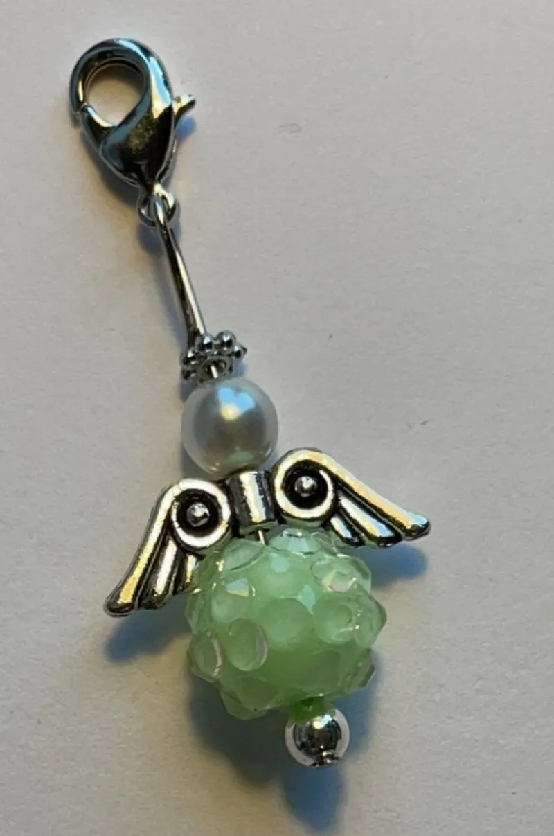 Lyckoängel med silverspänne och liten karbinhake, stenen är ljusgrön.
