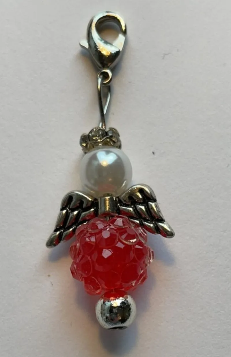Lyckoängel med silverspänne och liten karbinhake, stenen är röd.