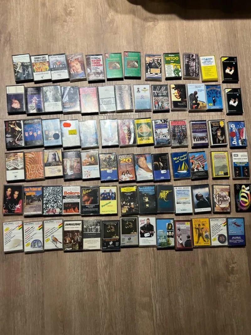 En omfattande samling kassettband med varierande artister och genrer. Bland annat representerade genrer är pop, rock, soul och reggae. Perfekt för samlare eller nostalgiker! Bilderna visar alla kassettband som ingår i samlingen. Klassisk musik och musikkår finns det flera av. Några artister är Carola, dr hook, mauro scocco.