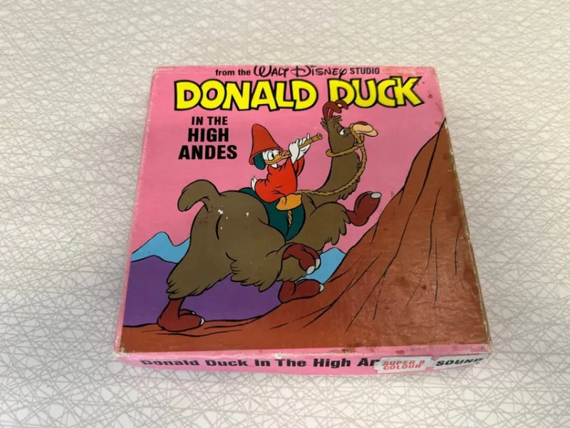 Super 8-film i färg och med ljud. Titeln är "Donald Duck in the High Andes" med undertitlen "from the Walt Disney Studio". Hela filmen är med och jag bifogar ett suddigt foto taget från när jag provtittade på filmen.