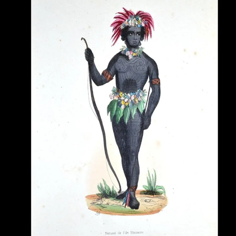 Naturel de l'ile Massacre. Handkolorerad litografi i klara och vackra färger med omsorgsfullt målade detaljer. Ur Auguste Wahlen "Moeurs, Usages et Costumes de tous les Peuples de Monde”, 1844. STORLEK: 25,5×16 cm. KVALITET: Bra skick. Ljusa småfläckar.