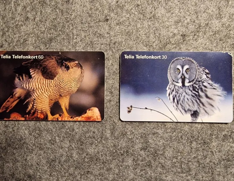 Två stycken Telia telefonkort med motiv av fåglar. Kortet med motiv av en uggla är värt 30 markeringar och kortet med motiv av en hök är värt 60 markeringar.