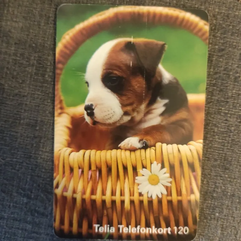 Säljer ett Telia Telefonkort med en söt valp i en korg. Perfekt för samlare av retro telefonkort eller för den som uppskattar söta djurmotiv.