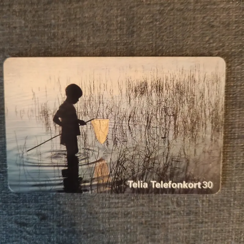 Telia Telefontkort 30. Motivet visar ett barn med en håv vid en sjö. Ett samlarkort för den intresserade.